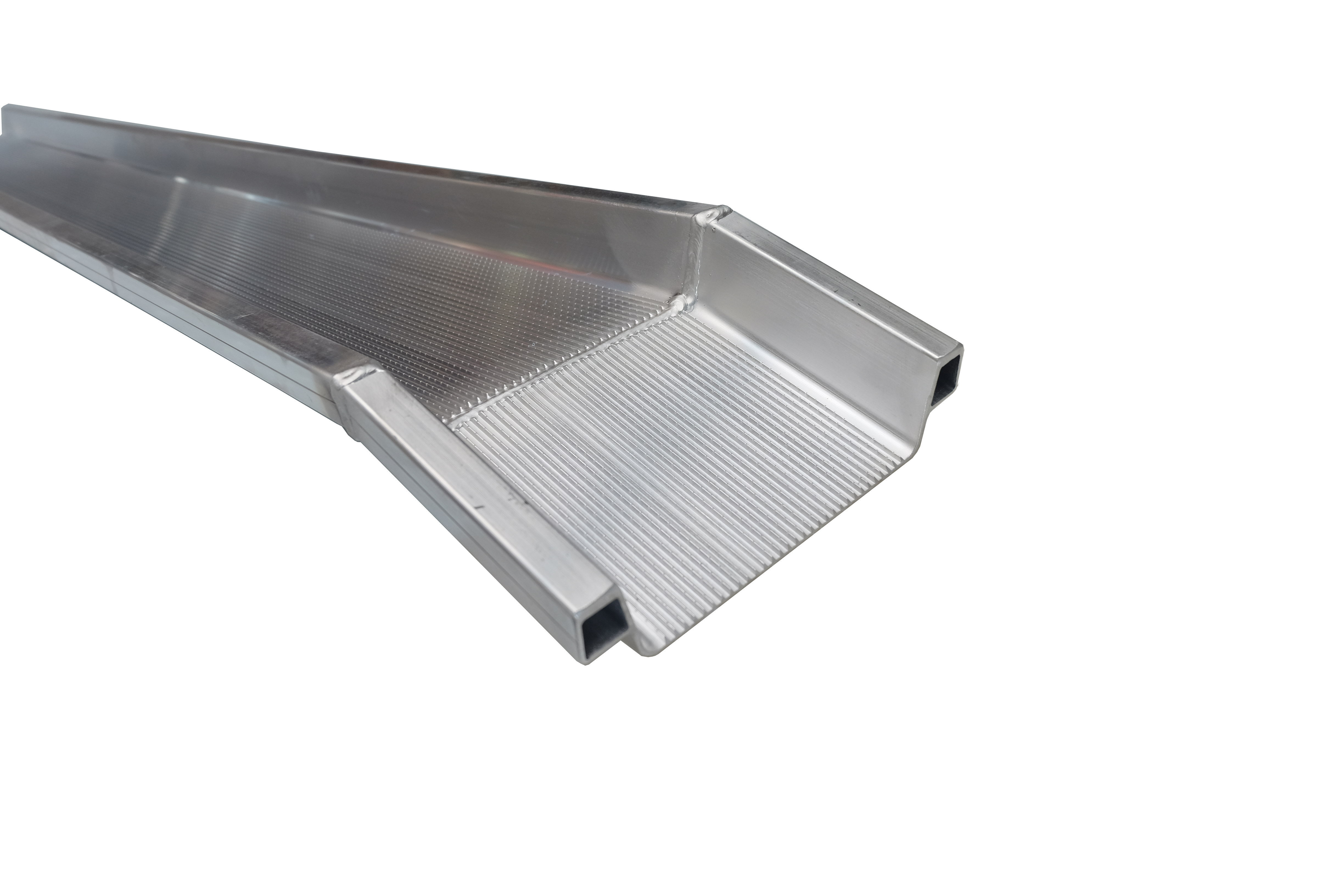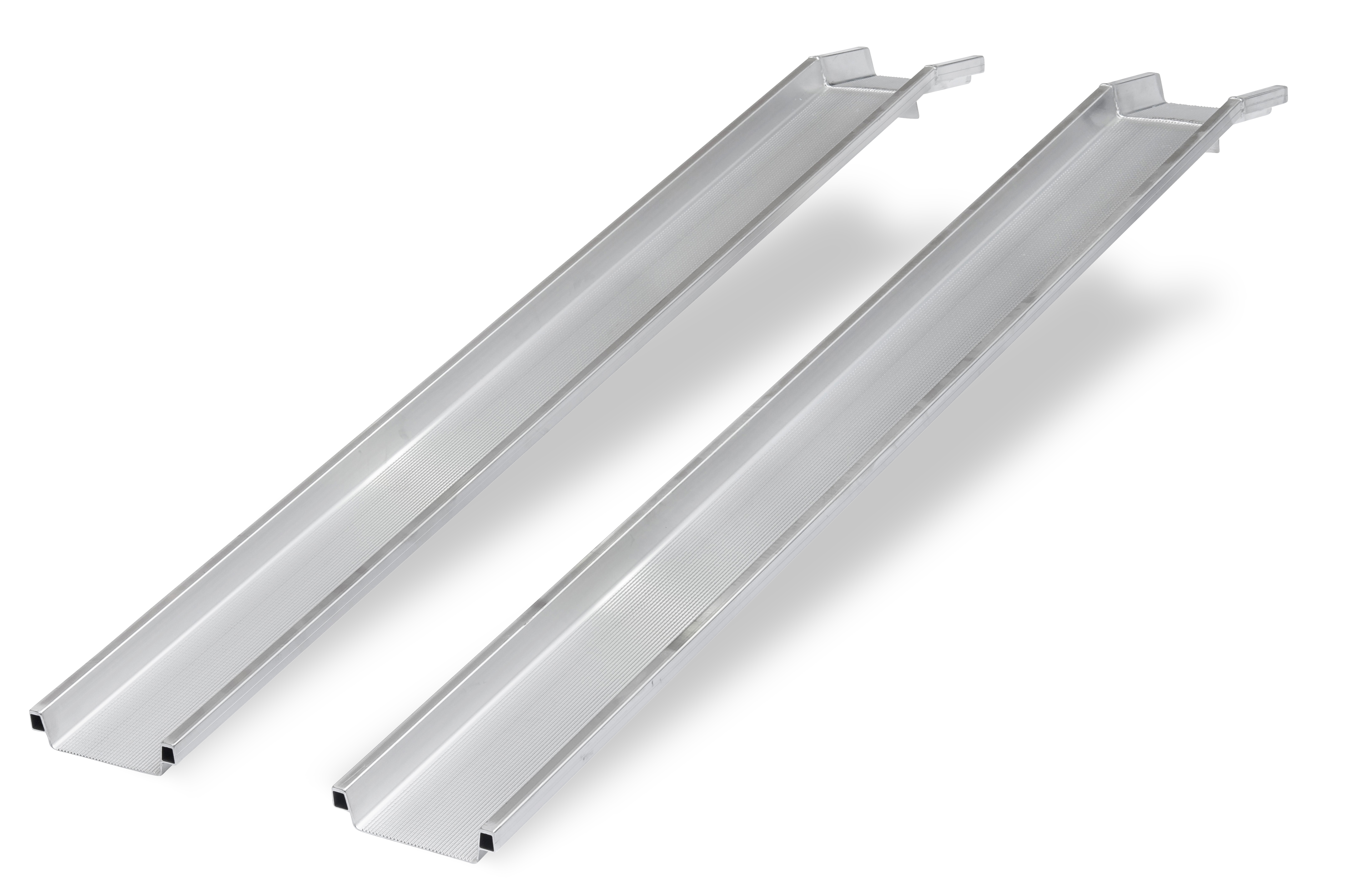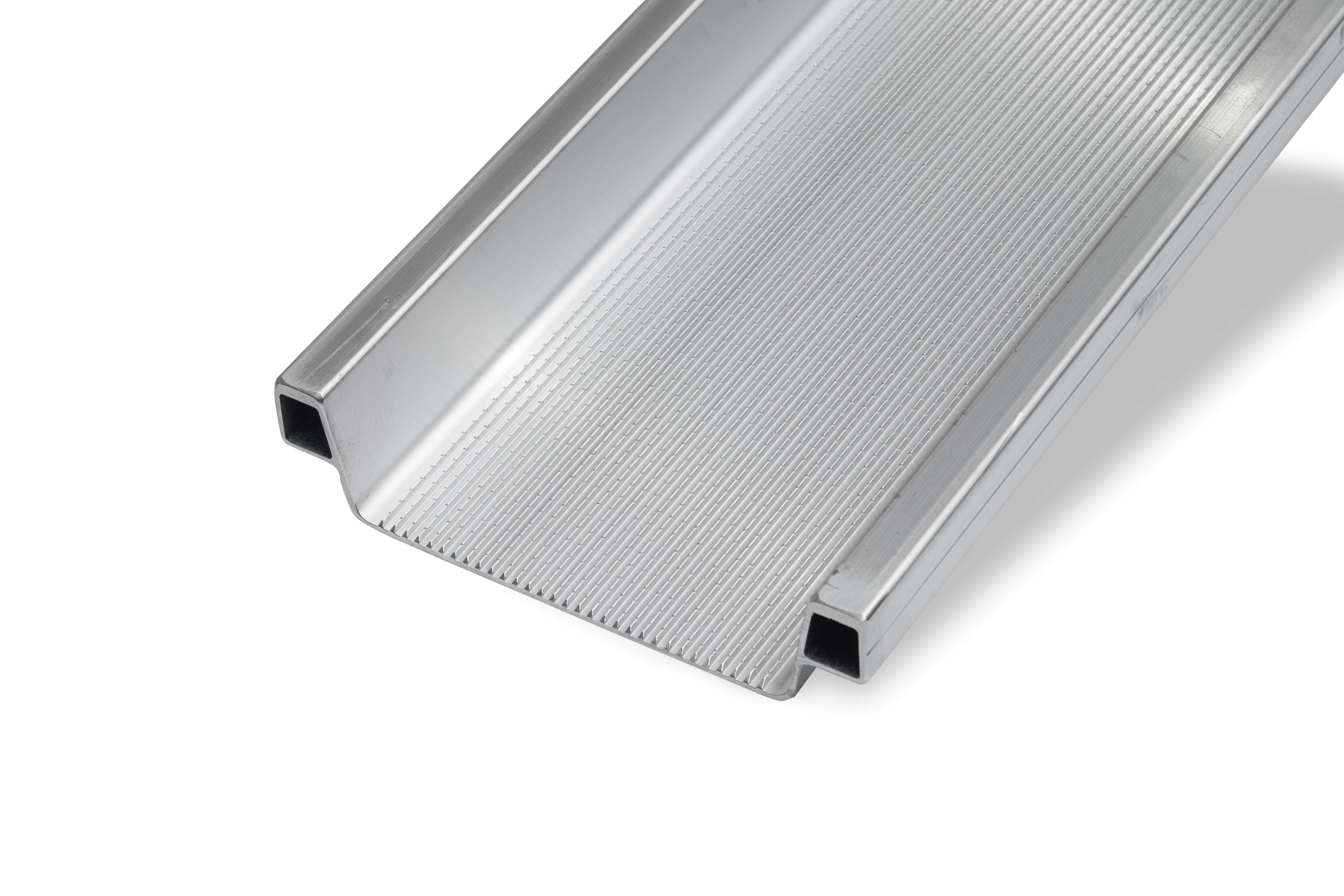 Die Konstruktion aus hochwertigem Aluminium überzeugt durch ein geringes Eigengewicht bei gleichzeitig hoher Tragfähigkeit und Stabilität. Eine integrierte Fahrrinne mit seitlichem Rand sorgt für zusätzliche Führung und erhöht die Sicherheit während der Nutzung. Die rutschhemmende Oberfläche unterstützt ein sicheres Befahren auch bei häufiger Anwendung.